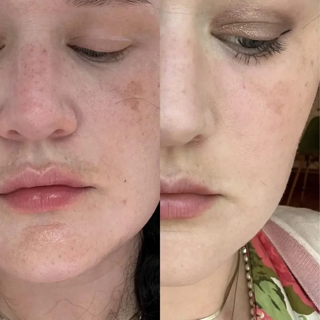 Skin that literally glowed in our fluorescent office lighting. Even tone where she’d had redness. Cheeks that bounced back when she pressed them during our video call.